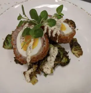 In other BeWell news, residents at Menno Haven in Chambersburg, PA, enjoyed Brussels sprouts, a BeWell ingredient which is rich in antioxidants and high in fiber! Jeremy Fry, Cura general manager of dining, served a Scottish Egg with roasted Brussels on whole grain with mustard drizzle. Residents were also tempted with a salad tossed with lean chicken breast, thinly shaved Brussels sprouts, shaved parmesan, candied walnuts, dried cherries and bacon, topped with a house-made apple vinaigrette!