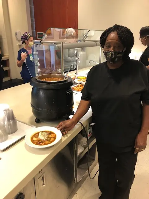 Highland Community healthcare workers make it a point to visit the café on Mondays for Ms. Janie’s traditional red beans and rice. Fridays are dedicated to Ms. Janie’s homemade “famous” chicken sausage shrimp gumbo, a “New Orleans” tradition at the hospital! She even prepares a separate pot of chicken gumbo for staff members who do not like seafood.”