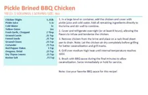 Nutritionally, Pickle-Brined BBQ Chicken packs a punch with 47g of protein per serving. Other nutritional highlights include 129mg cholesterol, 12g total fat (3g saturated), 11g carbohydrates, 2mg iron, 259mg sodium, and 416mg potassium. The sodium comes primarily from the brine, so if you’re watching your intake, consider omitting any added salt in the recipe.